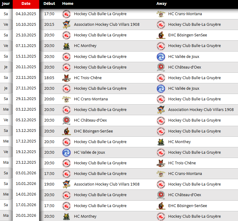 Calendrier de la saison 2025-2026 2.10.20247.10.2025 Partagez avec vos amis Lien vers les résultats de la saison régulière 2025-2026